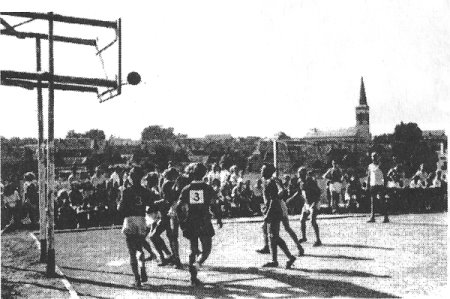 Auch Buben der 4. und 5. Klasse beteiligten sich an diesen ersten Basketballversuchen. Theo Clausen gab zeitweise Sportunterricht an der Roßdörfer Volksschule.